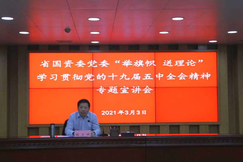 3月3日下午,根據省國資委黨委統一部署,省國資委黨委“舉旗幟 送理論”學習貫徹黨的十九屆五中全會精神宣講團報告會在集團20樓會議室舉行,宣講團成員、國元金控集團黨委副書記、董事姚立斌主持并作宣講報告。