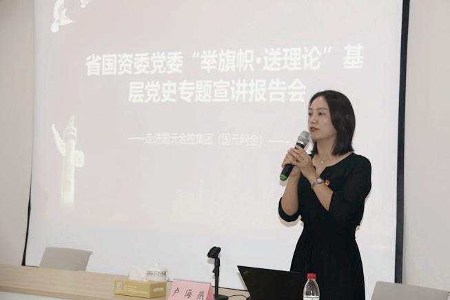 省國資委黨委“舉旗幟·送理論”基層黨史專題宣講報告會 7 月 22 日下午在國元金控集團旗下國元投資所屬國元網金公司舉行。省國資委黨委“舉旗幟·送理論”宣講團成員、華安證券合肥金寨路營業部副總經理盧海燕作專題宣講報告。