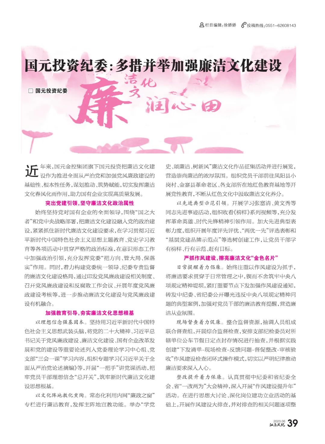 近日,安徽省紀委監委主辦的《江淮風紀》雜志2023年第6期刊發了國元金控集團所屬國元投資文章《國元投資紀委:多措并舉加強廉潔文化建設》。