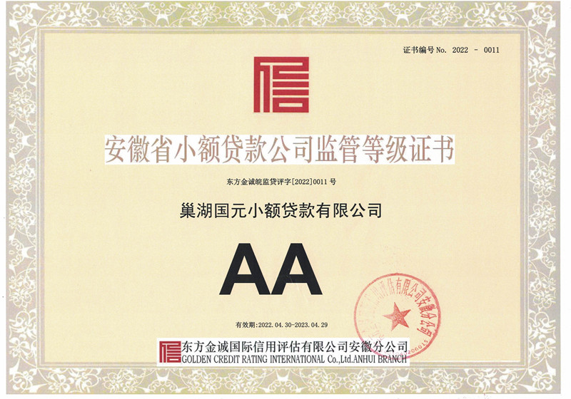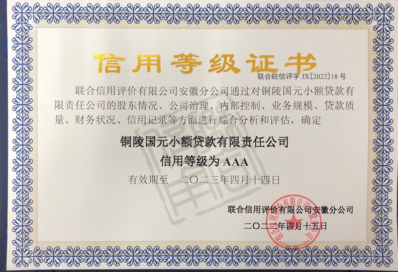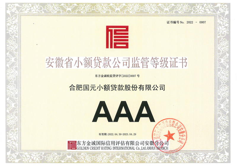 近日,由安徽省地方金融監管局組織開展的安徽省小額貸款公司2022年度信用評級結果正式公布,公司所屬合肥國元小貸、銅陵國元小貸、巢湖國元小貸分別獲評“AAA”、“AAA”和“AA”信用等級。