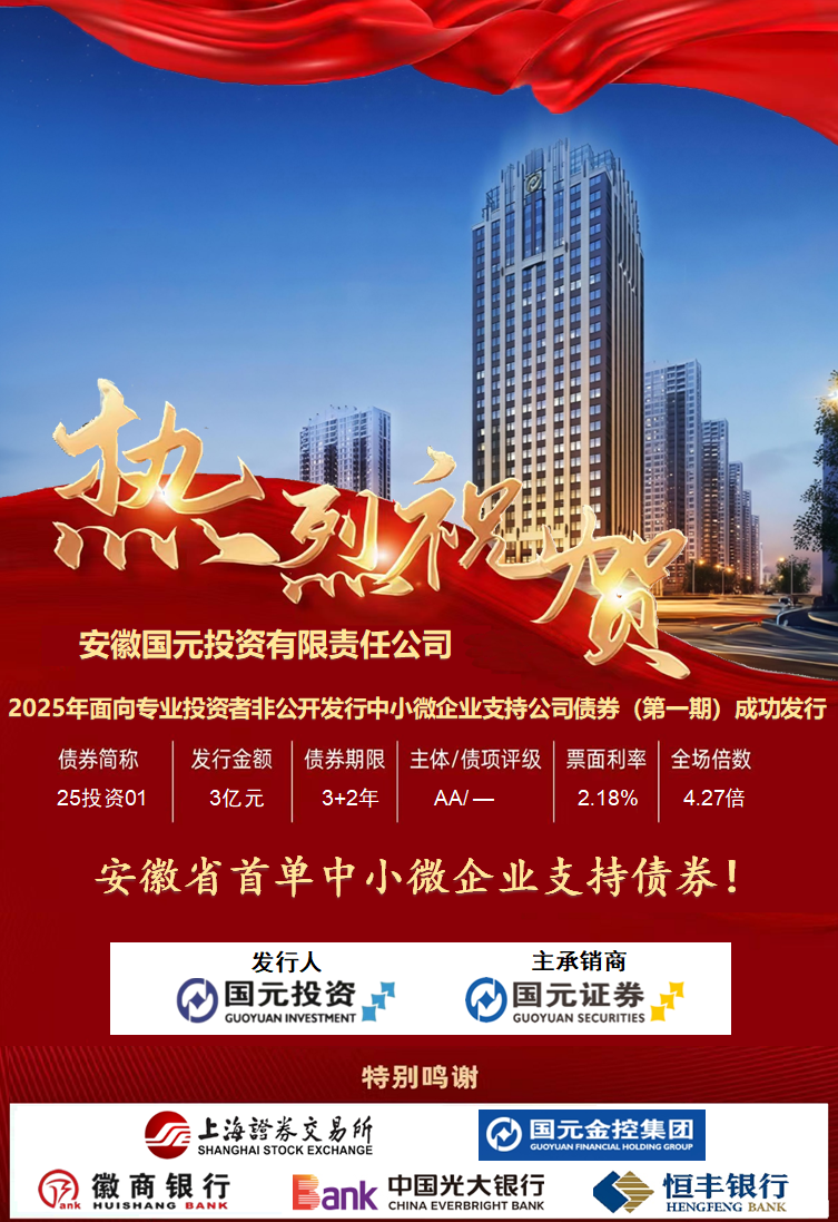 2025年5月28日,在國元金控集團的大力支持下,國元投資2025年面向專業投資者非公開發行中小微企業支持公司債券(第一期)在上海證券交易所成功發行。發行規模3億元人民幣,期限3+2年,票面利率2.18%,由國元金控集團提供擔保,主承銷商國元證券,托管機構華安證券。本期債券為安徽省首單中小微企業支持債券,不僅填補了安徽省中小微企業支持債券的空白,更標志著安徽省屬國有企業在運用創新金融工具服務實體經濟、落實普惠金融戰略上的重大突破。