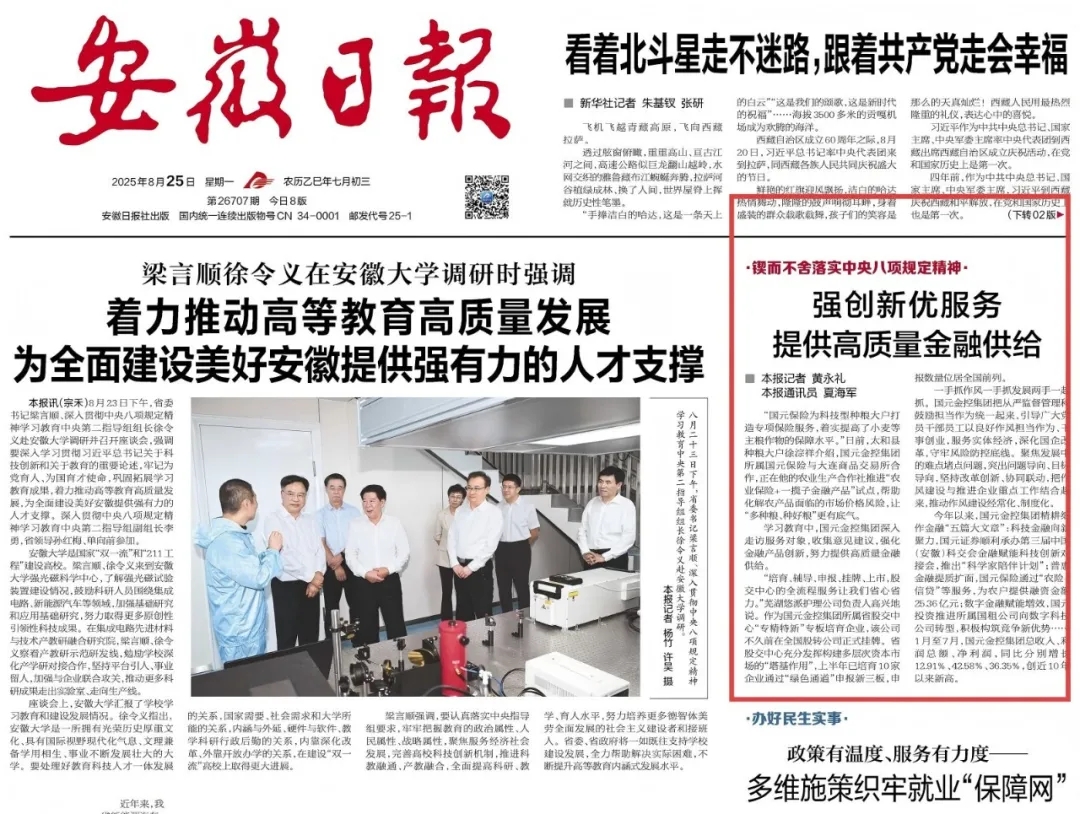 緊扣主線深化學習、全面查擺深入剖析、動真碰硬整改整治、警示教育以案促改、訪企入村紓困解難、開門教育可感可及、建章立制抓常抓長……走深走實的學習教育,讓集團廣大黨員、干部砥礪了政治品格、提高了思想覺悟、弘揚了優良作風。今年1—8月,集團主要經營指標創近10年最高值,安徽日報頭版兩次報道國元學習教育成效。