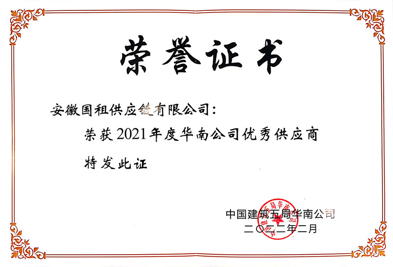 近日,安徽國租供應鏈有限公司在中建五局華南建設有限公司組織的2021年度供應商評比中,榮獲“優秀供應商”稱號。