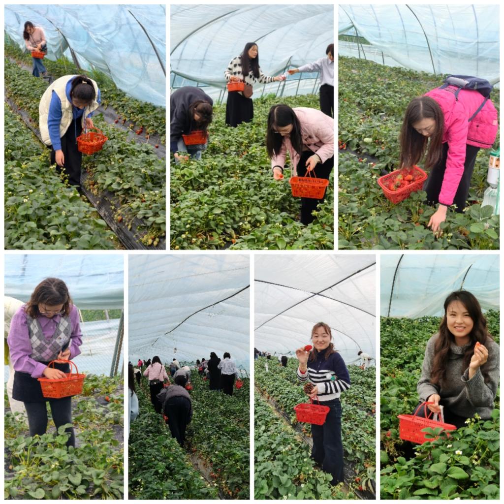 隨后,女員工們轉赴“大圩草莓”核心產區。春日的草莓大棚內,綠意盎然,果香四溢。一顆顆鮮紅飽滿的草莓點綴在翠綠的藤蔓間,格外喜人。女員工們手提果籃,穿梭其間,或彎腰細選,或相互品評,歡聲笑語不斷。大家紛紛表示親手采摘的不僅是香甜的果實,更是田園生活的樂趣與節日的喜悅。