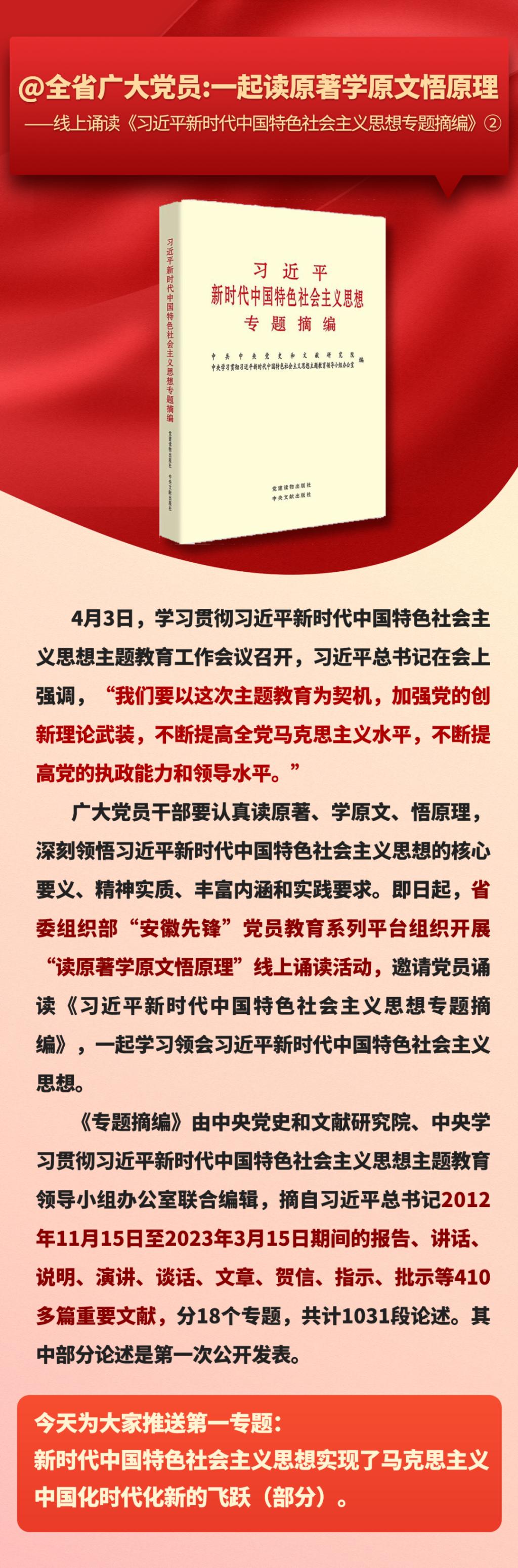 各級黨組織要把《專題摘編》納入主題教育學習計劃,組織黨員、干部原原本本學、逐字逐句悟,深刻領悟“兩個確立”的決定性意義,增強“四個意識”、堅定“四個自信”、做到“兩個維護”,切實把習近平新時代中國特色社會主義思想運用到貫徹落實黨的二十大提出的重大戰略部署中去,變成改造主觀世界和客觀世界的強大思想武器。