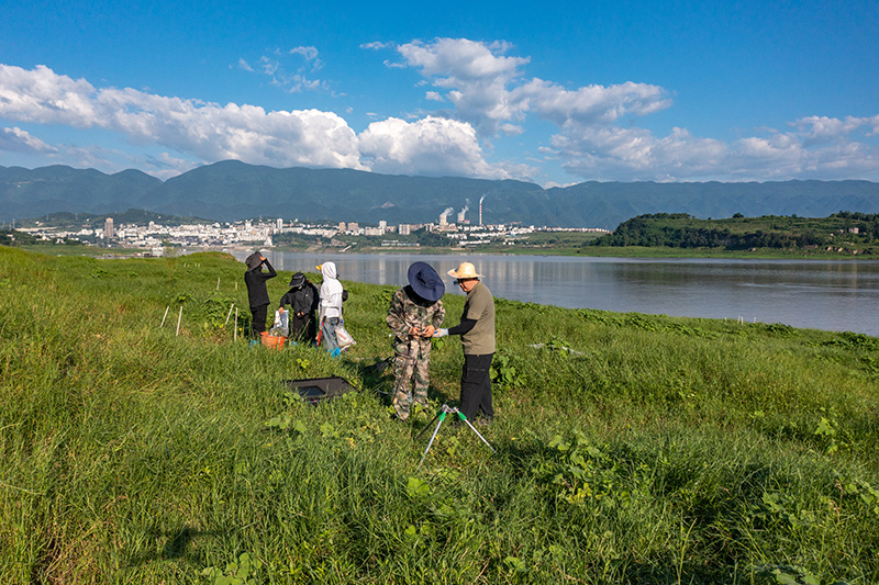 在位于重慶的中國科學院三峽庫區水土保持與環境研究站,中國科學院成都山地所科研人員在庫區消落帶上開展相關監測(2023年7月5日攝,無人機照片)。新華社記者 黃偉 攝