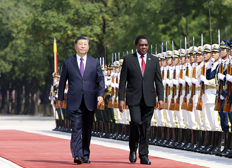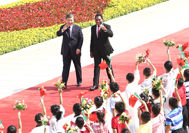 9月15日上午,國家主席習近平在北京人民大會堂同來華進行國事訪問的贊比亞總統希奇萊馬舉行會談。這是會談前,習近平在人民大會堂東門外廣場為希奇萊馬舉行歡迎儀式。新華社記者 龐興雷 攝?