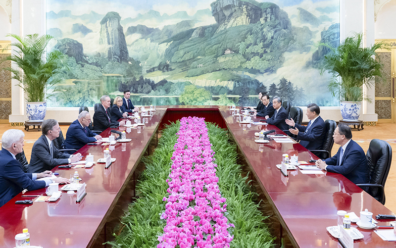 10月9日下午,國(guó)家主席習(xí)近平在北京人民大會(huì)堂會(huì)見(jiàn)美國(guó)國(guó)會(huì)參議院多數(shù)黨領(lǐng)袖舒默率領(lǐng)的美國(guó)國(guó)會(huì)參議院兩黨代表團(tuán)。新華社記者 翟健嵐 攝