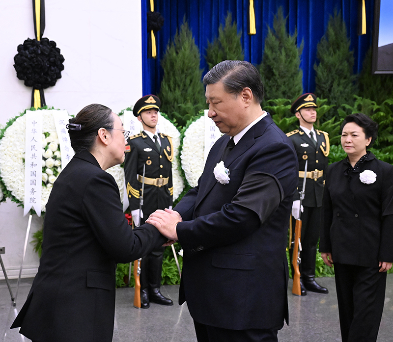 11月2日,李克強同志遺體在北京八寶山革命公墓火化。習近平、李強、趙樂際、王滬寧、蔡奇、丁薛祥、李希、韓正等前往八寶山送別,胡錦濤送花圈表示哀悼。這是習近平與李克強親屬握手,表示深切慰問。新華社記者 謝環馳 攝