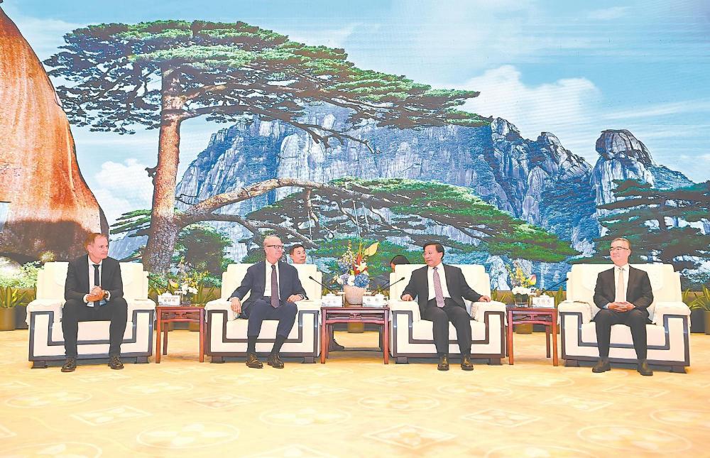 10月10日晚,省委書記韓俊、省長王清憲在合肥與大眾汽車集團監事會主席潘師、管理董事會主席奧博穆一行舉行工作會談。(記者 楊竹 攝)